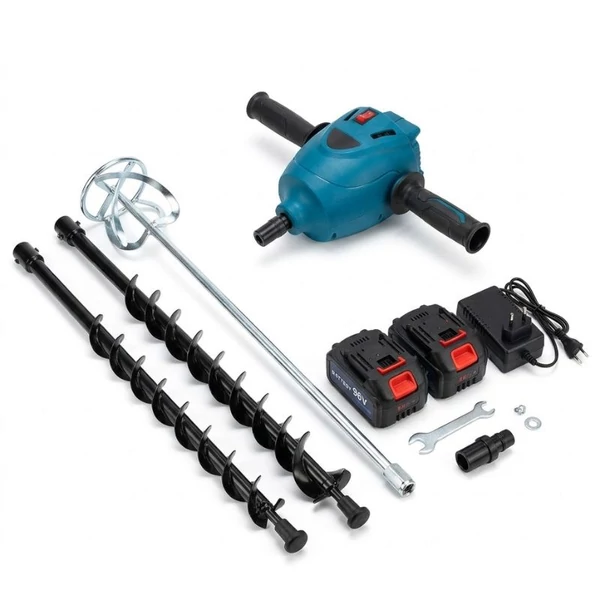 A kétkezes, ergonomikus markolat stabil és biztonságos tartást garantál a keményebb talajban végzett fúrás vagy a sűrűbb anyagok keverése közben is. A csomagban található két darab cserélhető akkumulátor (a gyártói "96V" jelöléssel) biztosítja, hogy a munka távol a konnektoroktól is folyamatos lehessen.