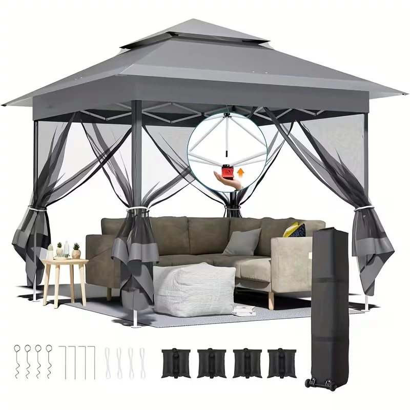 Ez a 3 × 3 méteres összecsukható sátor kiváló választás kültéri programokra, kertbe, teraszra, piacra vagy kempingezéshez. A sátor dupla tetős kialakítással és négy oldalpanelel rendelkezik, ami plusz árnyékot és védelmet biztosít az időjárás változásai ellen. A sátor anyaga UV‑védett, így ideális napsütéses időszakokra is.