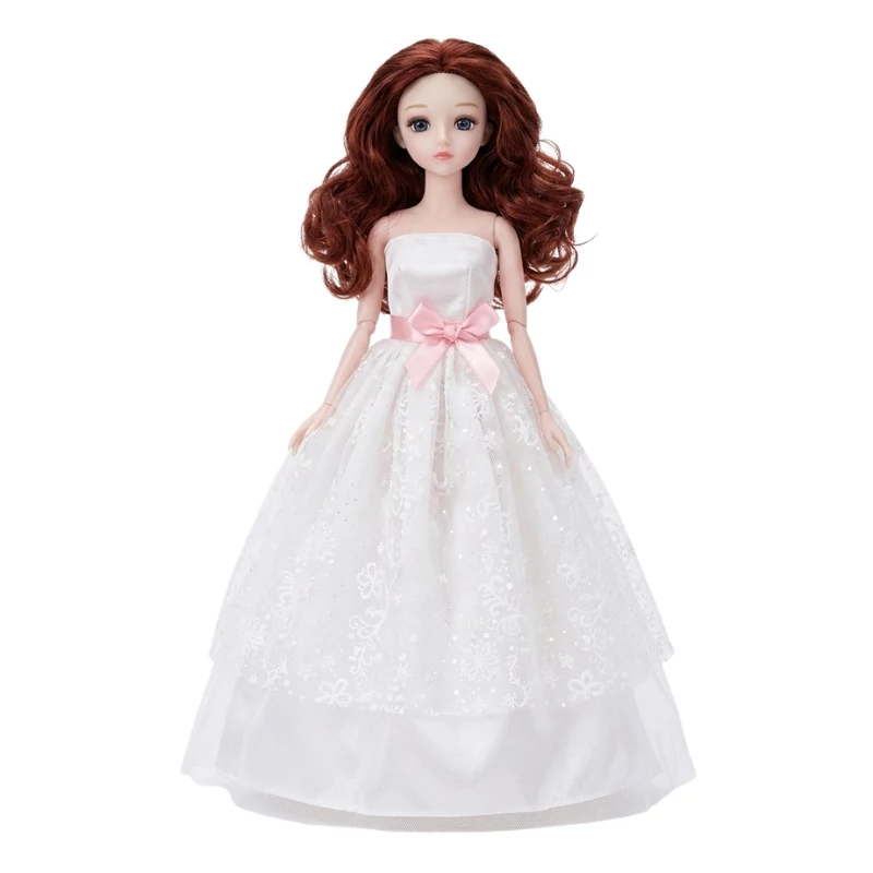 Az öltözete egy aprólékosan kidolgozott hófehér báli ruha melynek felső rétegét elegáns csipkeminta díszíti. A derékrészen elhelyezett halványrózsaszín masni még bájosabbá teszi a megjelenését. Ez a nagyméretű baba kiváló választás azoknak a gyerekeknek akik szeretik az öltöztetős szerepjátékokat és a hercegnős történeteket de gyűjtői darabként vagy szobadíszként is megállja a helyét.