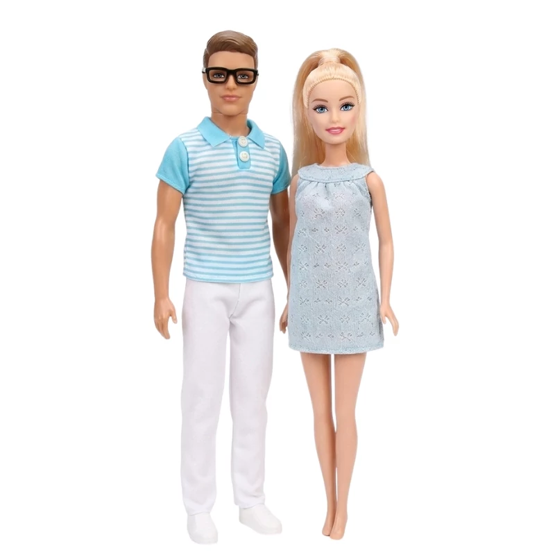 Két teljes méretű baba: Lucy és társa modern, stílusos ruházatban.