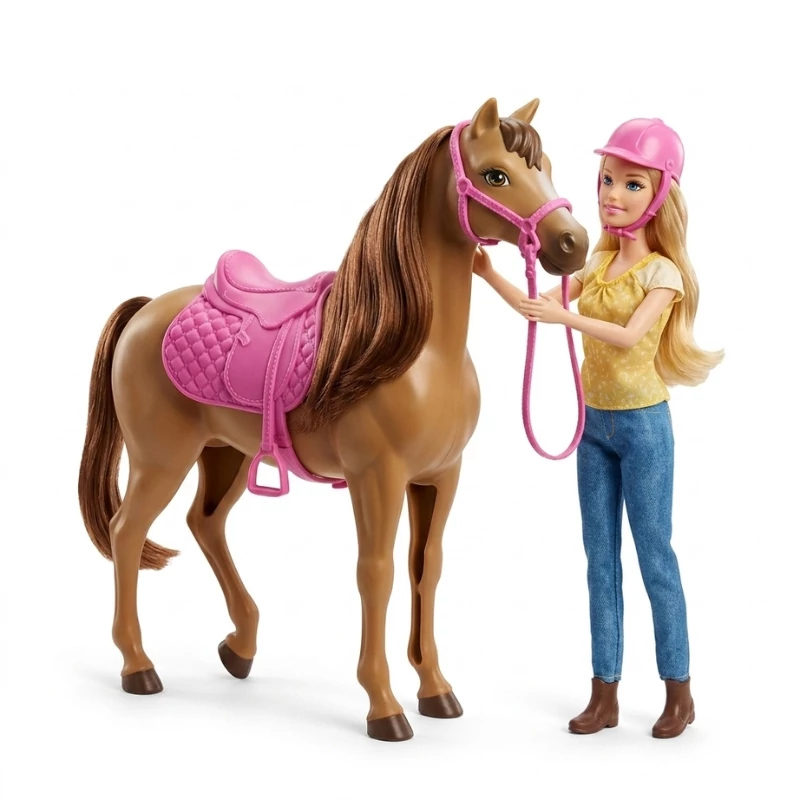 A ló kidolgozása részletgazdag, hosszú, selymes barna sörénnyel rendelkezik, amelyet a gyerekek kedvükre fésülhetnek vagy díszíthetnek. A szett részét képezi a lovagláshoz elengedhetetlen, díszes rózsaszín nyereg és a kantár is. Ez a játék kiváló lehetőséget nyújt az állatok szeretetére és a gondoskodásra való neveléshez, miközben fejleszti a gyermekek képzelőerejét és kreatív szerepjátékait a szabadban vagy a gyerekszobában.