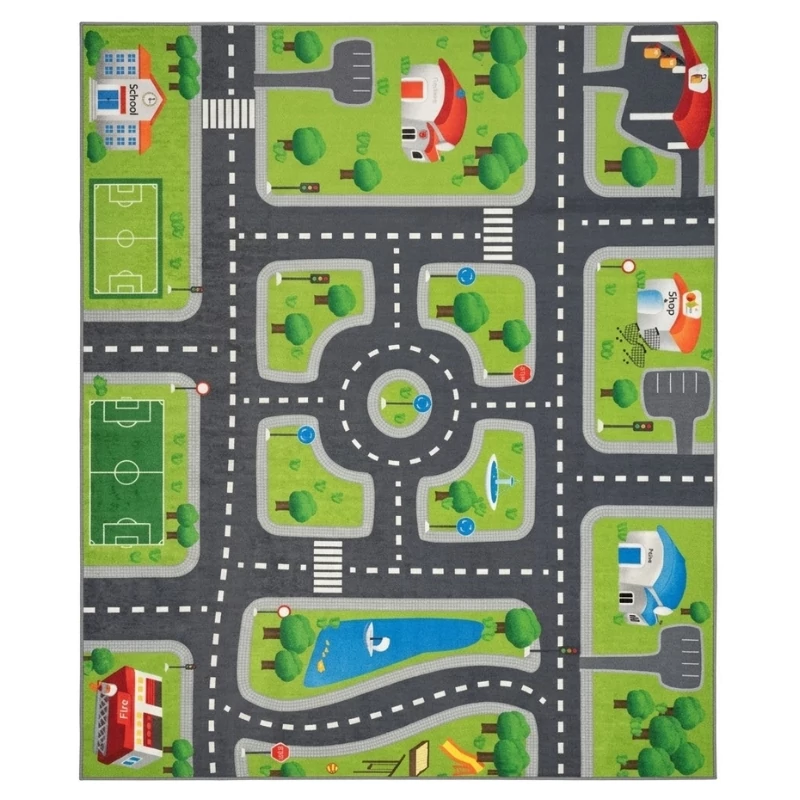 Ez a vidám, élénk színekkel készült gyerekszőnyeg egy zöld parkokkal tarkított kisvárost jelenít meg, ahol az utak, körforgalmak és kereszteződések izgalmas játékteret biztosítanak. A részletes mintán tavak, játszóterek, üzletek és épületek is helyet kaptak, így a gyerekek saját történeteket alkothatnak játék közben.