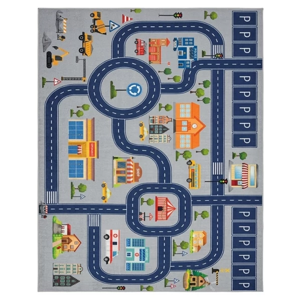 Ez a színes, részletgazdag mintájú gyerekszőnyeg egy teljes kisvárost varázsol a szobába. Az úthálózat, körforgalmak, parkolók és különböző épületek – iskola, bolt, kórház – izgalmas játékteret biztosítanak, ahol a gyerekek saját történeteket alkothatnak.