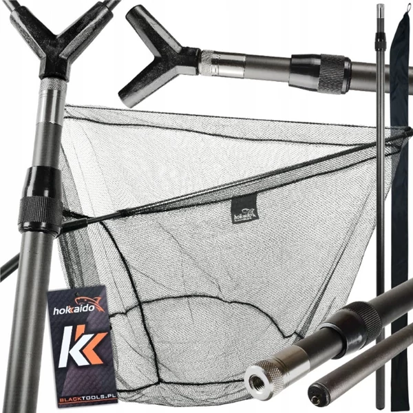 A nyél 2 részes kivitelű, teljes hossza kb. 2,5 méter, így megfelelő hatótávolságot biztosít parton, stégen vagy nehezebben hozzáférhető helyeken is. A szállítás és tárolás miatt a szett kompakt méretre szétszerelhető.