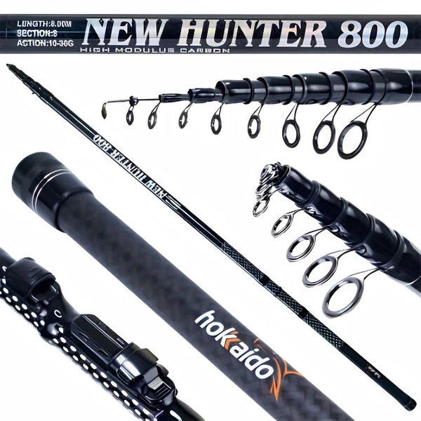 A Hokkaido New Hunter 8 méteres teleszkópos horgászbot egy erős, mégis könnyű kivitelű bot, amelyet kifejezetten úsztatós és finomszerelékes horgászathoz terveztek. A high modulus karbon anyag nagyobb merevséget és tartósságot biztosít, így pontosabb irányítást és jobb kontrollt ad a horgászat során.