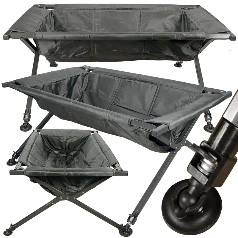 A bölcső állítható lábakkal rendelkezik, így egyenetlen talajon is stabilan beállítható. Ez különösen hasznos parton, köves vagy sáros terepen.