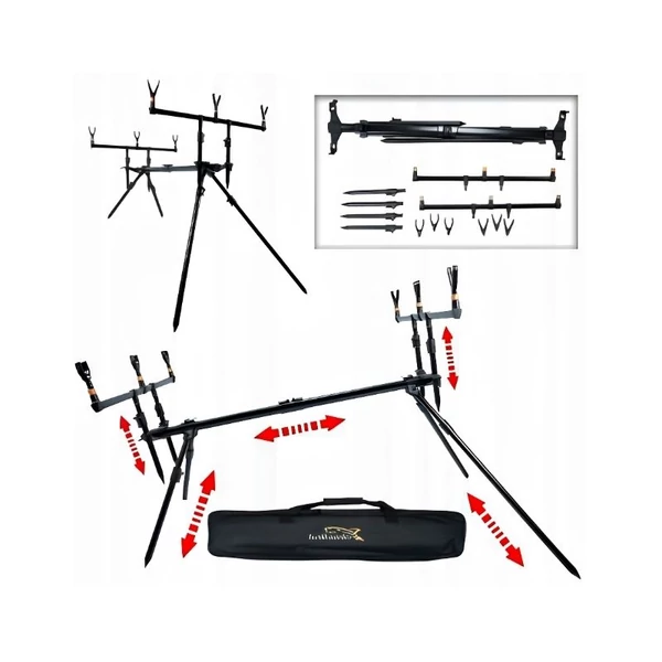 Sokoldalúan állítható, tripod kialakítású rod pod állvány, amely ideális választás 3 bot stabil és precíz elhelyezéséhez. A tripod rendszer gyors felállítást és kiváló stabilitást biztosít még egyenetlen talajon is, ami különösen hasznos terepen vagy part menti horgászat során.