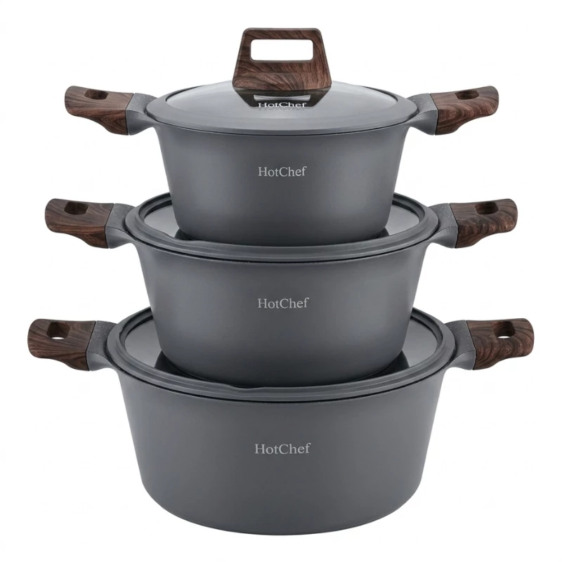 A HotChef szürke változata a modern és letisztult konyhai berendezések tökéletes kiegészítője. A selymes matt szürke felület és a természetes hatású, sötét fa mintázatú fogantyúk harmóniája különleges esztétikai élményt nyújt. A készlet három különböző kapacitású lábast foglal magában, amelyeket a mindennapi intenzív használatra terveztek.