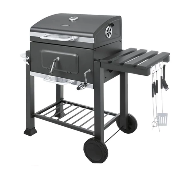 A praktikus kialakítást oldalsó és alsó polcok egészítik ki, amelyek elegendő helyet biztosítanak eszközök, alapanyagok vagy faszén tárolására. A kerekekkel ellátott szerkezet könnyen mozgatható, így egyszerűen áthelyezhető a kertben vagy a teraszon.