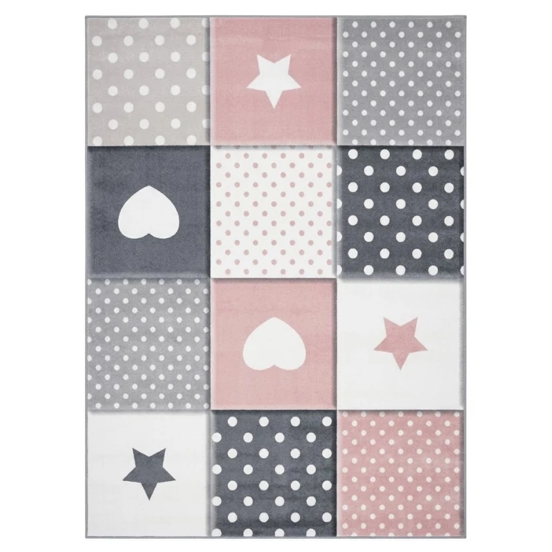 Ez a modern, kockákból álló mintájú szőnyeg harmonikus és barátságos megjelenést biztosít bármely helyiségben. A különböző minták – pöttyök, csillagok és szív formák – finoman váltakoznak, így egyszerre játékos és letisztult összhatást keltenek.