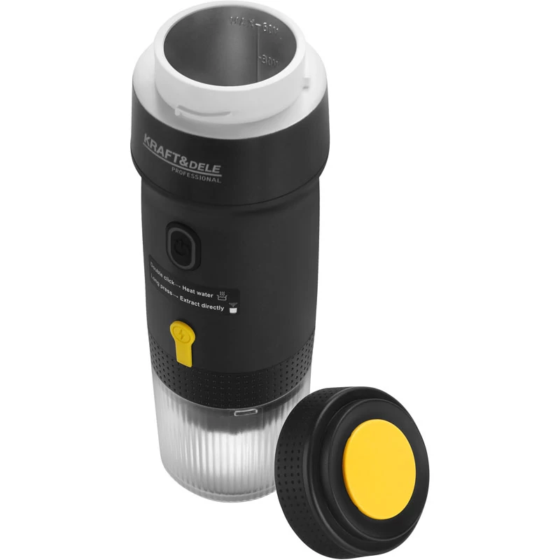 A Kraft&Dele KD4284 hordozható kávéfőző egy kompakt, utazásra tervezett készülék, amellyel bárhol élvezheted a frissen főzött kávét. Ideális autóba, irodába, kiránduláshoz vagy kempingezéshez, ahol nincs hagyományos kávéfőző.