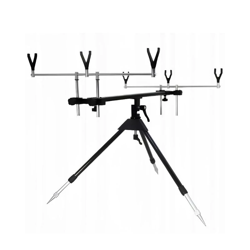 Stabil tripod rendszerű rod pod állvány, amely ideális választás 3 horgászbot egyidejű használatához. A háromlábú kialakítás kiváló egyensúlyt biztosít, így egyenetlen vagy kemény talajon is biztonságosan használható, ami különösen fontos pontyhorgászat során.