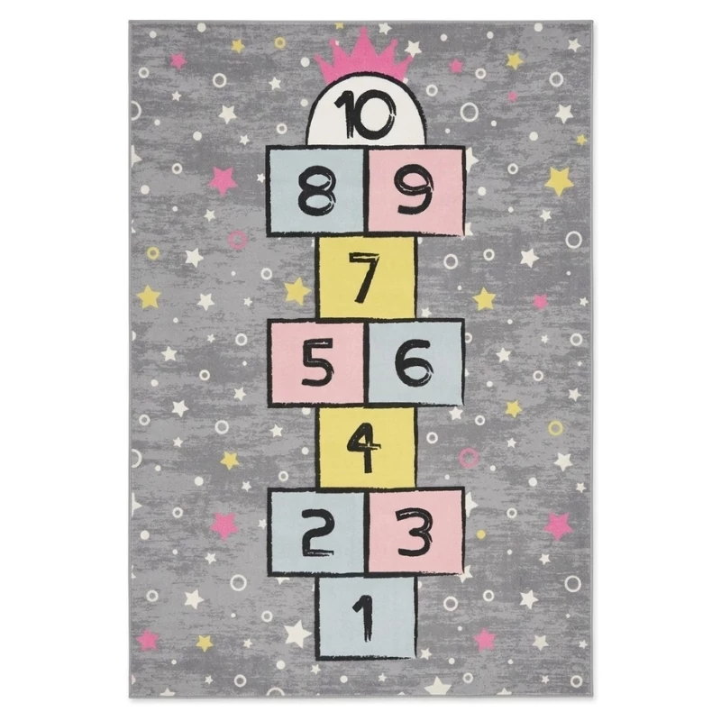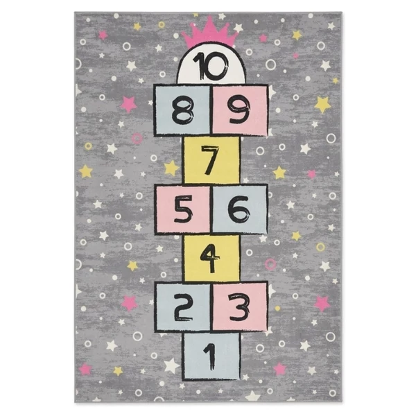 Ez a játékos és tanulságos mintájú szőnyeg klasszikus ugróiskola elrendezést ábrázol, amely mozgásra és aktív játékra ösztönzi a gyerekeket. A számozott mezők segítik a számok felismerését és a tanulást, miközben szórakoztató időtöltést biztosítanak.